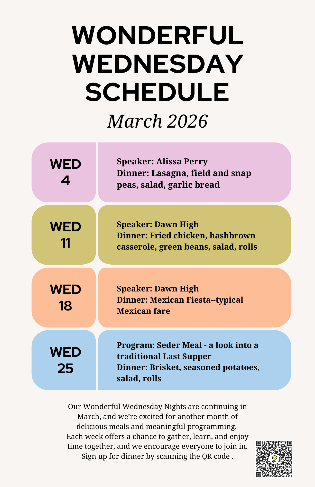 Come gather during the months of September-May at 5:30 PM for a delicious dinner, followed by Bible studies for all ages and choir practice. It's a wonderful time to connect, learn, and grow together! We look forward to seeing you there!